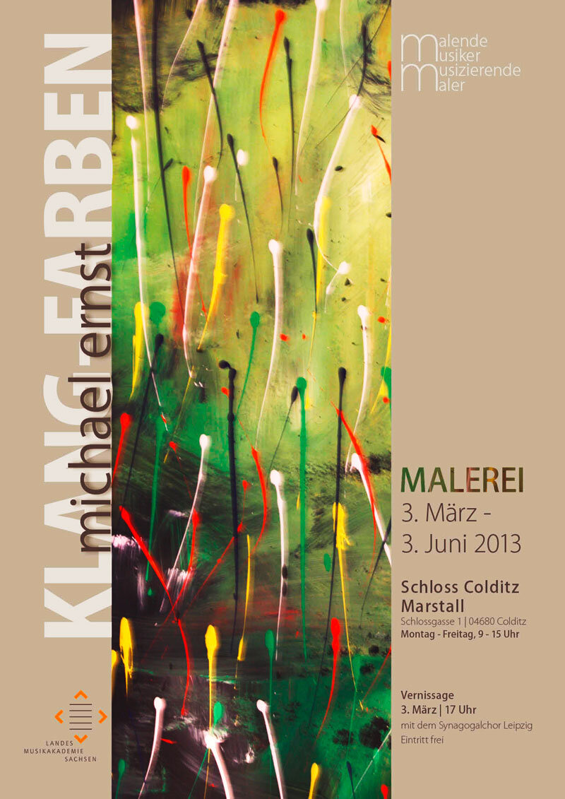 Die Ausstellung trägt den Titel »Klang-Farben: Bilder zur Musik«. In Farben und Formen setzt sich Michael Ernst mit Klang und Rhythmus auseinander, in Öl und Acryl entsteht auf der Leinwand assoziative Malerei zu musikalischen Themen. Ausstellungen fanden bereits in Leipzig, Dresden, München und Opole statt.