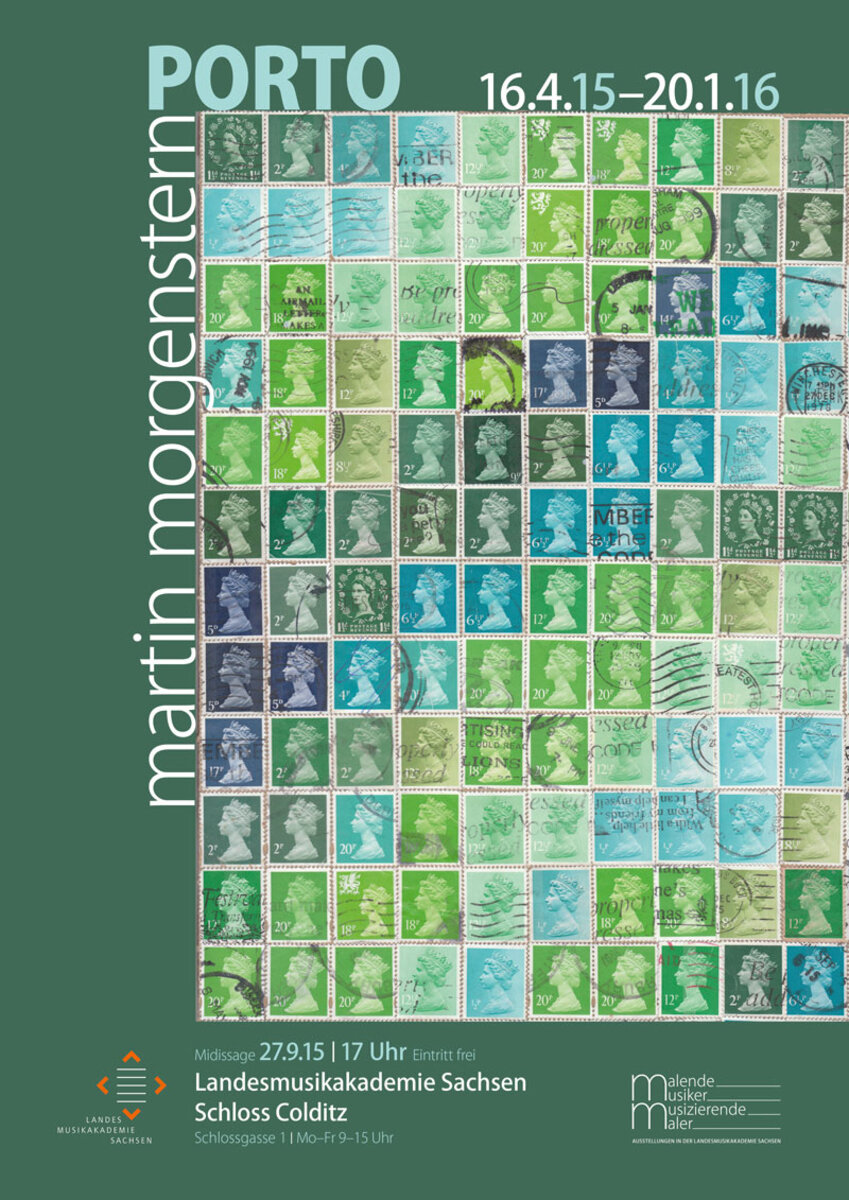 Tausende Queens auf Schloss Colditz – Zu den Feierlichkeiten in Stadt und Schloss Colditz anlässlich des 70. Jahrestages des Kriegsendes in den nächsten Wochen wird sie leider nicht persönlich anwesend sein, doch in der Landesmusikakademie Sachsen ist sie trotzdem tausendfach zu sehen: Queen Elisabeth II. Die englische Königin ist nämlich auf einer Dauermarkenserie des Vereinigten Königreiches abgebildet, und diese Briefmarken hat der Dresdner Künstler und Musiker Martin Morgenstern zu großformatigen Bildern »komponiert«. In der neunten Ausstellung »Malende Musiker – Musizierende Maler« sind die Collagen ab dieser Woche in den Räumen der Landesmusikakademie Sachsen ausgestellt.