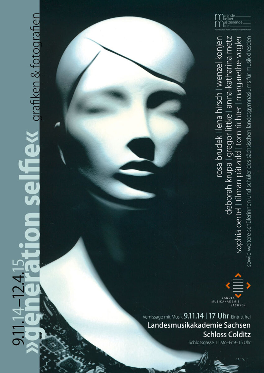 Selbstdarstellung und Inszenierung der eigenen Person sind heutzutage fester Bestandteil unseres Alltags. Die Spielarten des Selbstwahns begegnen uns in vielfältigen Formen, wobei die Selfies die populärste Form darstellen. Auf verschiedenen Wegen näherten sich die Schüler des Sächsischen Landesgymnasiums für Musik Carl Maria von Weber Dresden dieser Thematik. Aus den entstandenen Werken konzipierten die Leistungskurse Kunst eine Ausstellung mit dem Titel »Generation Selfie«. Die 8. Ausstellung der Reihe »Malende Musiker – Musizierende Maler« zeigte vorwiegend fotografische Arbeiten und Grafik