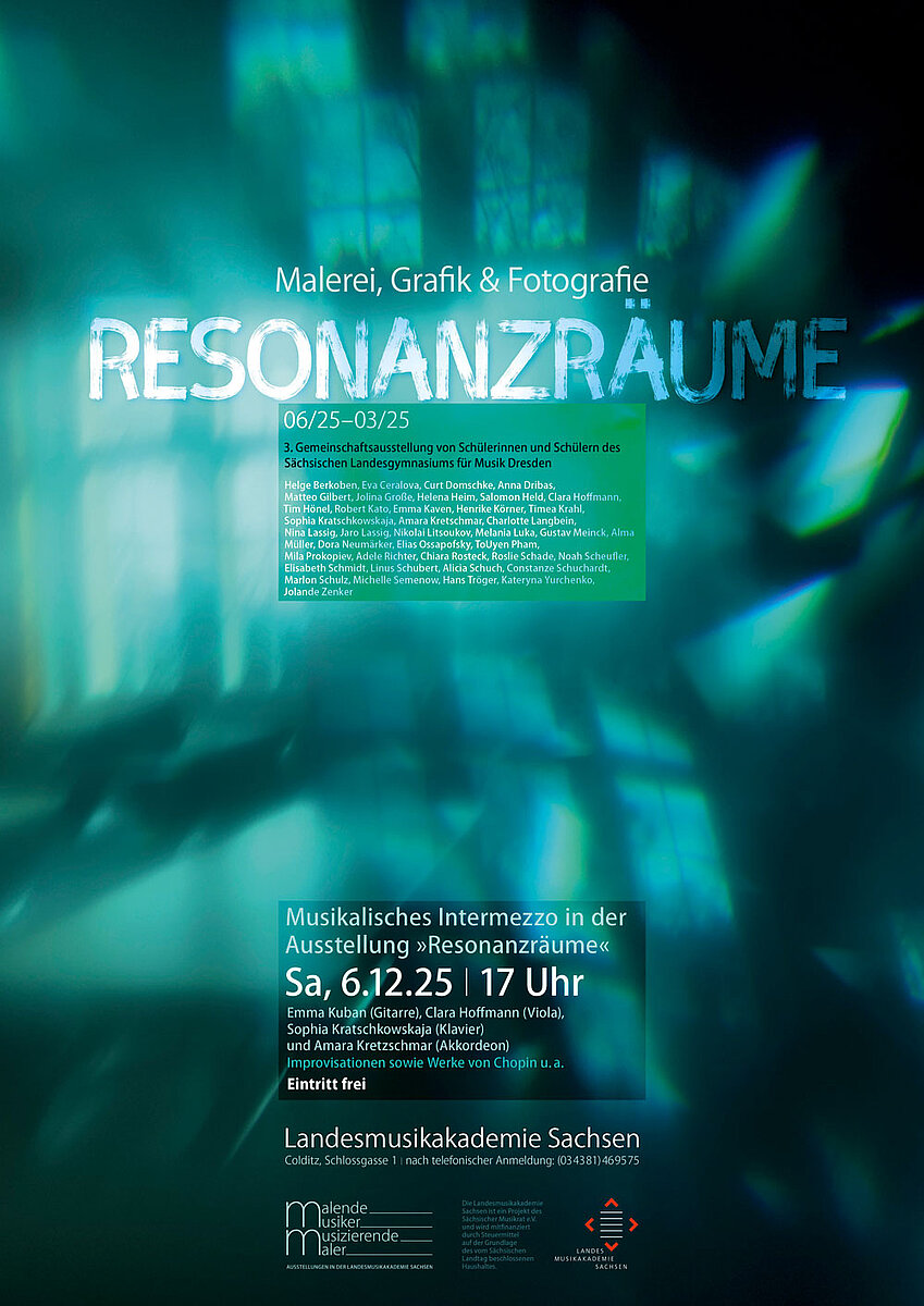 In der Begegnung von Klang und Farbe, von Idee und Form entsteht Resonanz: zwischen Colditz und Dresden, zwischen Generationen, zwischen Vergangenheit und Gegenwart, zwischen dem stillen Nachhall und dem ersten Entwurf. Die Ausstellung macht sichtbar, was in jungen Köpfen und Händen schwingt – was anklingt, nachwirkt, weiterwächst.