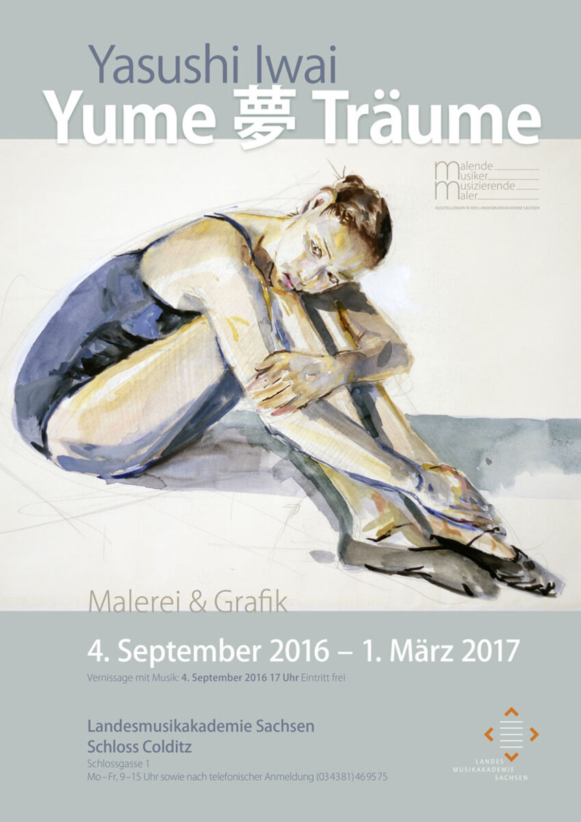 Der in Japan geborene und in Dresden lebende Maler, Grafiker und Musiker Yasushi Iwai brachte mit seiner Ausstellung »Yume 夢 Träume« – zumindest optisch – ein neues Genre in die Landesmusikakademie: den Tanz. Seine dem gegenständlichen Stil zuzuordnenden Arbeiten sind Portraits und Körperstudien von Tänzerinnen und Tänzern. Im Rahmen der Vernissage war der Künstler auch selbst am Cembalo musizierend zu erleben. Als studierter Kirchenmusiker ist er gleichermaßen malender Musiker, wie er als freischaffender Maler auch malender Musiker ist.