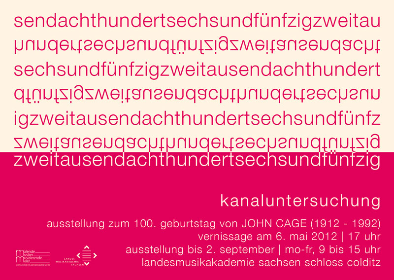 Die Installation zweitausendachthundertsechsundfünfzig nimmt im Jubiläumsjahr den Kontakt zu John Cage, einem der wichtigsten Künstler des 20. Jahrhunderts, auf. Cage arbeitete sehr universell: als Lyriker, Philosoph, Maler, Happeningkünstler und Komponist ergründete und definierte er den Inhalt von Kunst neu und schuf bahnbrechende, bis heute vielrezipierte und auch diskutierte Werke. In der Installation verschmelzen Texte, Textfragmente und Wörter von John Cage mit denen der Kanaluntersuchung. In Räumen, in denen normalerweise vielerlei Musik entsteht, kann man ein neuartiges, spannend-lyrisches Geflecht von gedanklichen, architektonischen und musikalischen Beziehungen entdecken – Kunst als Einladung zu Neuem.