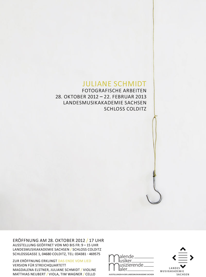 Juliane Schmidt, eine junge Künstlerin aus Dresden, die wenige Tagen vor Beginn dieser Ausstellung den Robert-Sterl-Preis für MeisterschülerInnen der Hochschule für Bildende Künste Dresden erhielt, stellte unter dem Titel »Fotografische Arbeiten« aus. Zu ihren Arbeiten sagt die Künstlerin selbst: »Die meisten Fotografien dieser Ausstellung sind keine. Zumindest nicht im fotografischen Sinn eines Abbildes von Vorgefundenem, einer Referenz der Realität. Es sind Ideen, Gedanken und Konzepte, für deren Fixierung sich der Rahmen des Mediums Fotografie eignet und anbietet.«