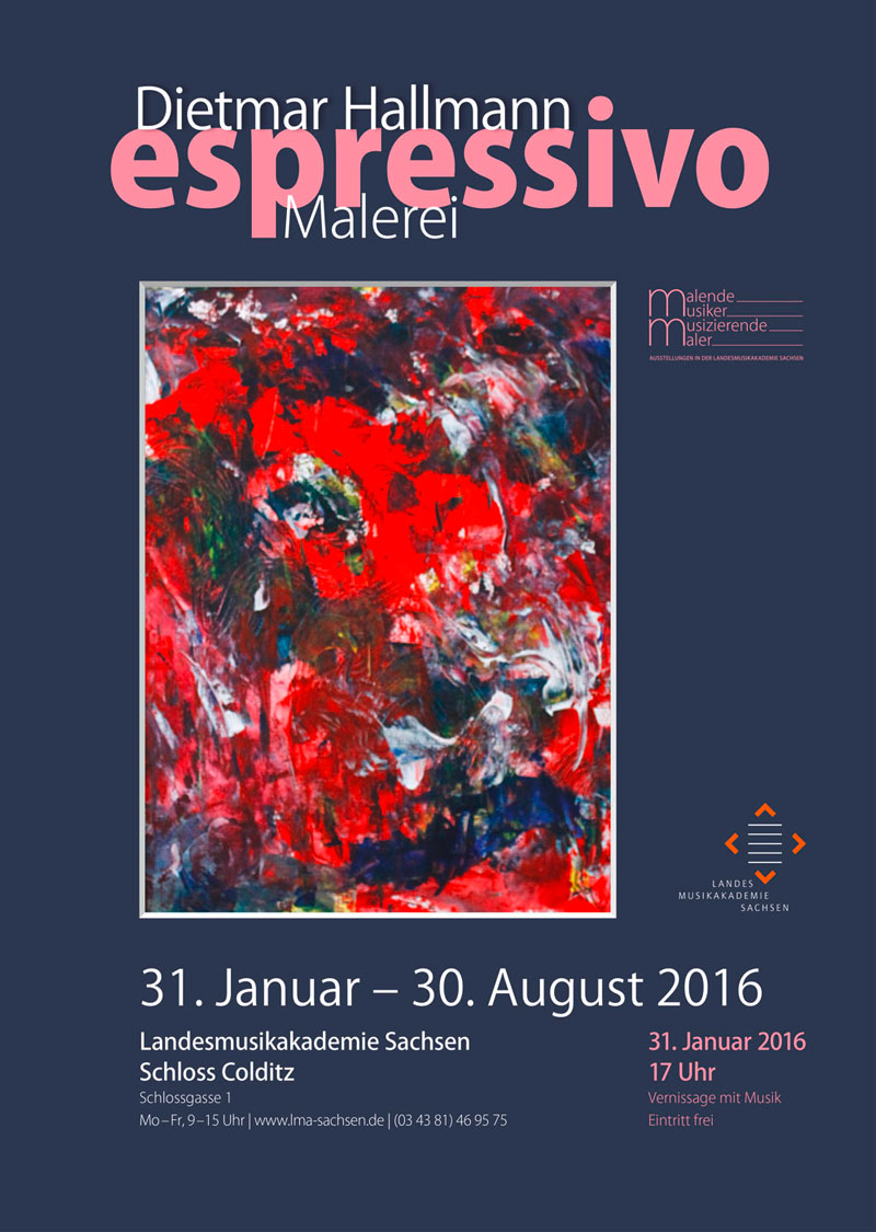 »espressivo« – unter diesem Titel firmierte die 10. Ausstellung der Reihe »Malende Musiker – musizierende Maler«". Der Leipziger Musiker und Maler Dietmar Hallmann zeigt farbintensive Arbeiten, die häufig musikalisch inspiriert sind. Das ist nicht verwunderlich, war doch der emeritierte Professor Hallmann zeit seines Berufslebens leidenschaftlicher und erfolgreicher Musiker. Bereits mit 22 Jahren trat er als Geiger in den Dienst des Gewandhausorchesters Leipzig, bevor er später auf die Viola wechselte und Solobratscher dieses renommierten Klangkörpers wurde. Als solcher war Hallmann lange Jahre Mitglied des Gewandhausquartetts. Erst mit dem Eintritt in das Rentenalter entstanden für ihn Freiräume, die er nutzte, um sich seiner weiteren Leidenschaft, dem Malen, zu widmen.