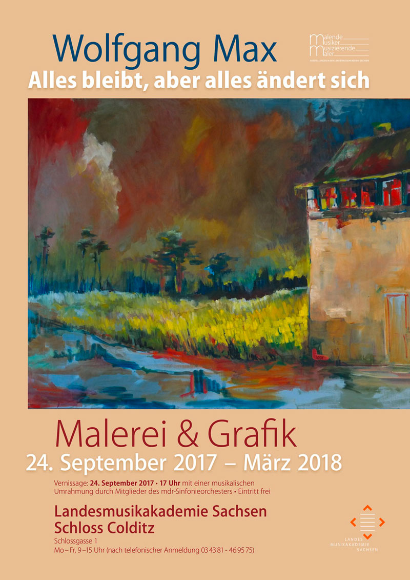 »Alles bleibt, alles ändert sich« – unter diesem Titel steht in der Landesmusikakademie Sachsen auf Schloss Colditz die aktuelle Ausstellung im Rahmen der Reihe »Malende Musiker – musizierende Maler«. Damit findet die mittlerweile etablierte Ausstellungsreihe ihre nunmehr zwölfte Fortsetzung. Und wieder ist es ein Orchestermusiker, der seine bildkünstlerischen Arbeiten in den schönen Räumen der Landesmusikakademie zeigt. Der mit seinem Atelier im Bahnhof Beucha ansässige Künstler Wolfgang Max spielt im Hauptberuf Bratsche im mdr-Sinfonieorchester. Zu sehen ist in Colditz ein repräsentativer Ausschnitt seines vielfältigen Schaffens in Malerei und Grafik, darunter mehrere Werke, in denen er sich mit dem Mythos des »Heiligen Sebastian« beschäftigt.