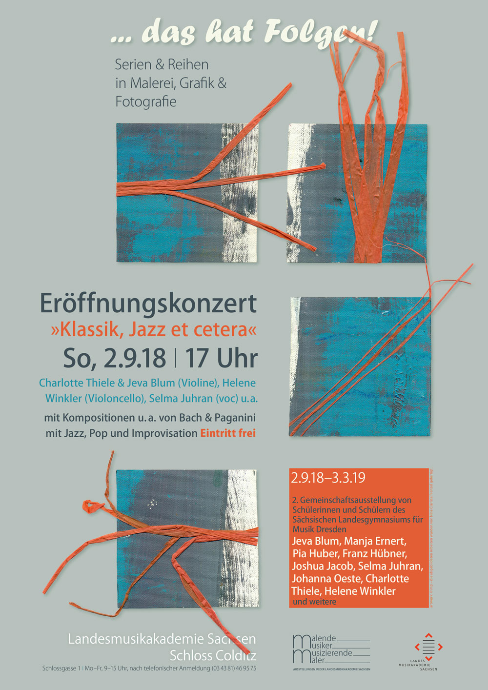 Kunst ist einmalig und lebt zugleich von Wiederholung und Varianz. So kann sie einem Vorbild folgen oder sich in Folgen, Serien, Reihen mit Themen und Methoden künstlerischen Arbeitens auseinandersetzen. Das ist auch im schulischen Kontext nicht anders, das Interessante an künstlerischen Ergebnissen von Schülern ist oftmals die Vielfalt und Varianz individueller Lösungen innerhalb einer künstlerischen Rahmenaufgabe der Gruppe/Klasse. In dieser Ausstellung sind Arbeiten von Schülerinnen und Schülern des Sächsischen Landesgymnasiums für Musik Carl Maria von Weber Dresden zu sehen, die auf verschiedene Weise folgenreich entwickelt worden.